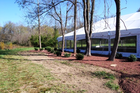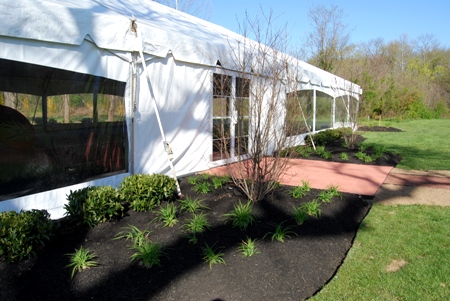 Things have been progressing nicely with the landscaping around the Open Aire Affairs tent. The sides of the new gravel path have been graded with dirt and seeded and the beds around the entrance to the tent have been planted with two small ornamental Kousa Dogwood trees, some ornamental grasses and some small, white flowering bushes (again, not sure yet of the specific plant varieties).